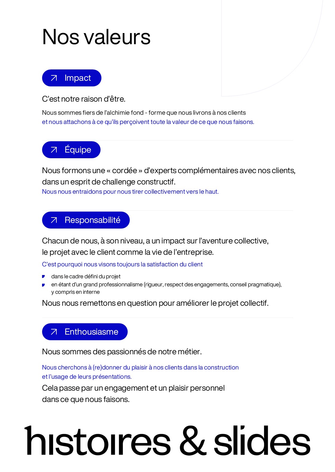 La possibilité de modifier la taille du document pour un format A4 ou A3 facilite la création d’affiches ou de posters. C’est comme ça que nous avons créé nos affiches « Nos valeurs », visibles dans nos bureaux. Avec PowerPoint, nous avons pu utiliser un fond et des couleurs qui correspondent à notre charte graphique et assurent la cohérence avec nos autres supports de communication.