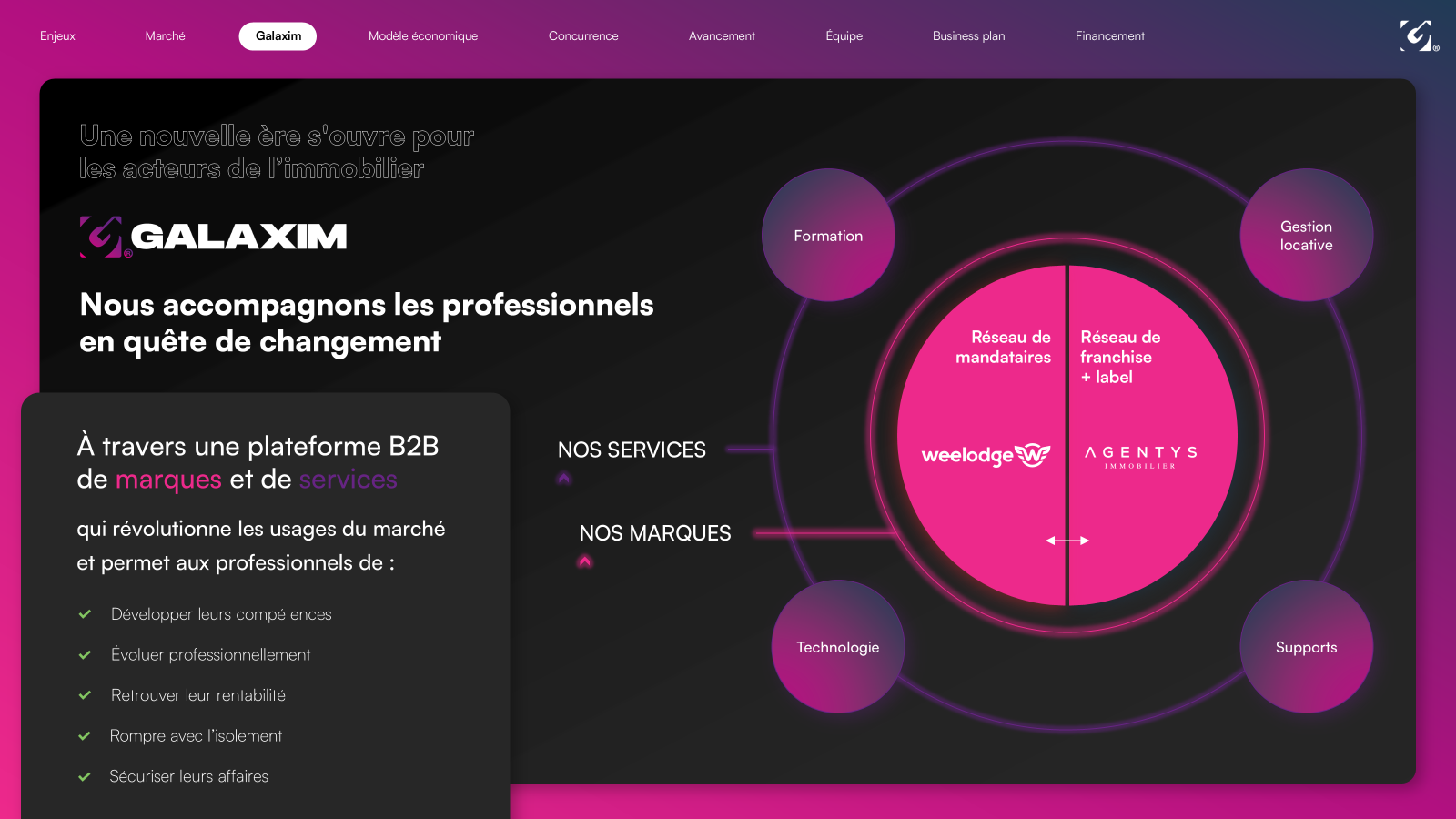 Vous formulez en 1 phrase choc votre promesse. Votre interlocuteur doit se poser la question : “comment peuvent-ils promettre une chose pareille ?” Cette page charnière entre problème et solution crée une forme de suspense dans votre présentation. Elle est évidemment unique et donc différenciante. - La solution proposée